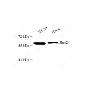 WB检测Seladin 1蛋白(货号 GB112463). 样品: 经RIPA裂解液(货号G2002)处理的蛋白质. 封闭: 3%脱脂牛奶(货号GC310001)溶于TBST溶液, 室温孵育1小时. —抗: 1: 500稀释, 4℃ 孵育过夜. 二抗: HRP标记山羊抗兔IgG (H+L) (货号GB23303), 1: 5000稀释, 室温孵育1小时. |