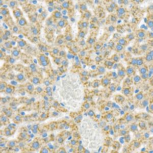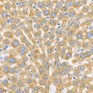 IHC检测Seladin 1蛋白(货号 GB112463). 样品: 小鼠肝, 4%多聚甲醛 (货号G1101) 固定12-24小时. 抗原修复: 柠檬酸抗原修复液(干粉, pH 6.0) (G1201), 98℃, 20分钟. —抗: 1: 1300稀释, 4℃ 孵育过夜. 二抗: HRP标记山羊抗兔IgG (H+L) (货号GB23303), 1: 200稀释, 室温孵育1小时. |