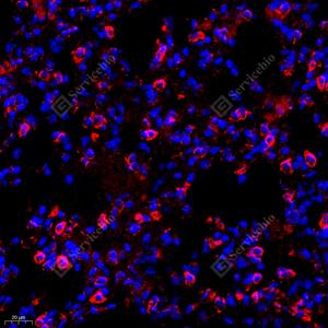 IF检测Seladin 1蛋白(货号 GB112463)(红色). 样品: 小鼠肺, 4%多聚甲醛 (货号G1101) 固定12-24小时. 抗原修复: Tris-EDTA抗原修复液(pH 9.0) (G1203), 98℃, 20分钟. 封闭: 3% BSA(货号GC305010)的PBS溶液, 室温孵育30分钟. —抗: 1: 650稀释, 4℃ 孵育过夜. 二抗: Cy3标记山羊抗兔IgG (H+L) (货号GB21303), 1: 300稀释, 室温孵育1小时. |