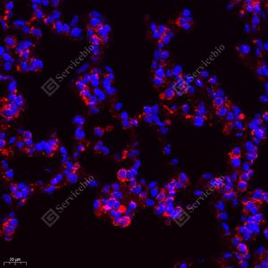 IF检测Seladin 1蛋白(货号 GB112463)(红色). 样品: 大鼠肺, 4%多聚甲醛 (货号G1101) 固定12-24小时. 抗原修复: Tris-EDTA抗原修复液(pH 9.0) (G1203), 98℃, 20分钟. 封闭: 3% BSA(货号GC305010)的PBS溶液, 室温孵育30分钟. —抗: 1: 650稀释, 4℃ 孵育过夜. 二抗: Cy3标记山羊抗兔IgG (H+L) (货号GB21303), 1: 300稀释, 室温孵育1小时. |