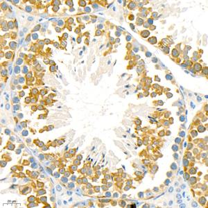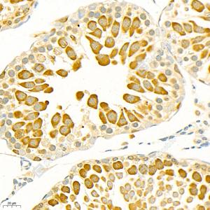 IHC检测Stathmin 1蛋白(货号 GB11784). 样品: 小鼠睾丸, 4%多聚甲醛 (货号G1101) 固定12-24小时. 抗原修复: 柠檬酸抗原修复液(干粉, pH 6.0) (G1201), 98℃, 20分钟. —抗: 1: 3000稀释, 4℃ 孵育过夜. 二抗: HRP标记山羊抗兔IgG (H+L) (货号GB23303), 1: 200稀释, 室温孵育1小时. |