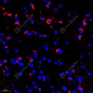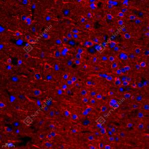 IF检测Stathmin 1蛋白(货号 GB11784)(红色). 样品: 小鼠脑, 4%多聚甲醛 (货号G1101) 固定12-24小时. 抗原修复: Tris-EDTA抗原修复液(pH 9.0) (G1203), 98℃, 20分钟. 封闭: 3% BSA(货号GC305010)的PBS溶液, 室温孵育30分钟. —抗: 1: 600稀释, 4℃ 孵育过夜. 二抗: Cy3标记山羊抗兔IgG (H+L) (货号GB21303), 1: 300稀释, 室温孵育1小时. |