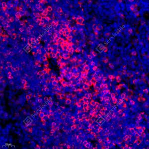 IF检测Stathmin 1蛋白(货号 GB11784)(红色). 样品: 小鼠胸腺, 4%多聚甲醛 (货号G1101) 固定12-24小时. 抗原修复: Tris-EDTA抗原修复液(pH 9.0) (G1203), 98℃, 20分钟. 封闭: 3% BSA(货号GC305010)的PBS溶液, 室温孵育30分钟. —抗: 1: 600稀释, 4℃ 孵育过夜. 二抗: Cy3标记山羊抗兔IgG (H+L) (货号GB21303), 1: 300稀释, 室温孵育1小时. |