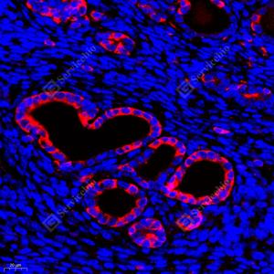 IF检测Stathmin 1蛋白(货号 GB11784)(红色). 样品: 小鼠子宫, 4%多聚甲醛 (货号G1101) 固定12-24小时. 抗原修复: Tris-EDTA抗原修复液(pH 9.0) (G1203), 98℃, 20分钟. 封闭: 3% BSA(货号GC305010)的PBS溶液, 室温孵育30分钟. —抗: 1: 600稀释, 4℃ 孵育过夜. 二抗: Cy3标记山羊抗兔IgG (H+L) (货号GB21303), 1: 300稀释, 室温孵育1小时. |