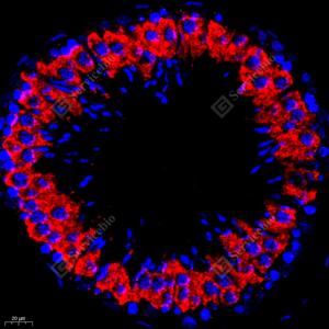 IF检测Stathmin 1蛋白(货号 GB11784)(红色). 样品: 大鼠睾丸, 4%多聚甲醛 (货号G1101) 固定12-24小时. 抗原修复: Tris-EDTA抗原修复液(pH 9.0) (G1203), 98℃, 20分钟. 封闭: 3% BSA(货号GC305010)的PBS溶液, 室温孵育30分钟. —抗: 1: 600稀释, 4℃ 孵育过夜. 二抗: Cy3标记山羊抗兔IgG (H+L) (货号GB21303), 1: 300稀释, 室温孵育1小时. |