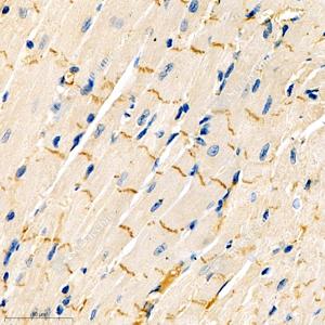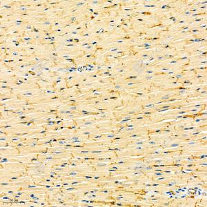 IHC检测Synphilin 1蛋白(货号 GB111991). 样品: 大鼠心, 4%多聚甲醛 (货号G1101) 固定12-24小时. 抗原修复: Tris-EDTA抗原修复液(pH 9.0) (G1203), 98℃, 20分钟. —抗: 1: 650稀释, 4℃ 孵育过夜. 二抗: HRP标记山羊抗兔IgG (H+L) (货号GB23303), 1: 200稀释, 室温孵育1小时. |