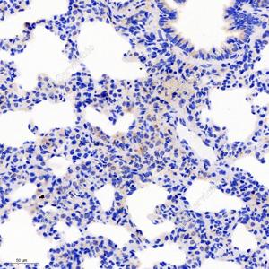 IHC检测SIRP alpha蛋白(货号 GB11914). 样品: 大鼠肺, 4%多聚甲醛 (货号G1101) 固定12-24小时. 抗原修复: 柠檬酸抗原修复液(干粉, pH 6.0) (G1201), 98℃, 20分钟. —抗: 1: 3600稀释, 4℃ 孵育过夜. 二抗: HRP标记山羊抗兔IgG (H+L) (货号GB23303), 1: 200稀释, 室温孵育1小时. |