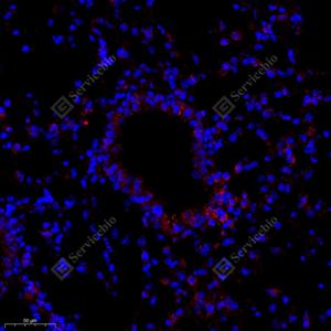 IF检测SIRP alpha蛋白(货号 GB11914)(红色). 样品: 小鼠肺, 4%多聚甲醛 (货号G1101) 固定12-24小时. 抗原修复: Tris-EDTA抗原修复液(pH 9.0) (G1203), 98℃, 20分钟. 封闭: 3% BSA(货号GC305010)的PBS溶液, 室温孵育30分钟. —抗: 1: 1000稀释, 4℃ 孵育过夜. 二抗: Cy3标记山羊抗兔IgG (H+L) (货号GB21303), 1: 300稀释, 室温孵育1小时. |