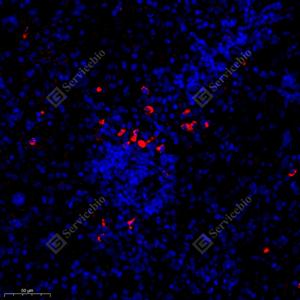 IF检测SIRP alpha蛋白(货号 GB11914)(红色). 样品: 大鼠脾, 4%多聚甲醛 (货号G1101) 固定12-24小时. 抗原修复: Tris-EDTA抗原修复液(pH 9.0) (G1203), 98℃, 20分钟. 封闭: 3% BSA(货号GC305010)的PBS溶液, 室温孵育30分钟. —抗: 1: 1000稀释, 4℃ 孵育过夜. 二抗: Cy3标记山羊抗兔IgG (H+L) (货号GB21303), 1: 300稀释, 室温孵育1小时. |