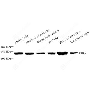 WB检测ERC2蛋白(货号 GB121055). 样品: 经RIPA裂解液(货号G2002)处理的蛋白质. 封闭: 封闭: 3%脱脂牛奶(货号GC310001)溶于TBST溶液, 室温孵育1小时. —抗: 1: 1000稀释, 4℃ 孵育过夜. 二抗: HRP标记山羊抗小鼠IgG (H+L) (货号GB23301), 1: 5000稀释, 室温孵育1小时. |
