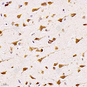 IHC检测ELAVL3蛋白(货号 GB112599). 样品: 小鼠脑, 4%多聚甲醛 (货号G1101) 固定12-24小时. 抗原修复: 柠檬酸抗原修复液(干粉, pH 6.0) (G1201), 98℃, 20分钟. —抗: 1: 1800稀释, 4℃ 孵育过夜. 二抗: HRP标记山羊抗兔IgG (H+L) (货号GB23303), 1: 200稀释, 室温孵育1小时. |