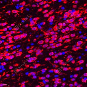 IF检测ELAVL3蛋白(货号 GB112599)(红色). 样品: 小鼠胚胎小鼠, 4%多聚甲醛 (货号G1101) 固定12-24小时. 抗原修复: Tris-EDTA抗原修复液(pH 9.0) (G1203), 98℃, 20分钟. 封闭: 3% BSA(货号GC305010)的PBS溶液, 室温孵育30分钟. —抗: 1: 700稀释, 4℃ 孵育过夜. 二抗: Cy3标记山羊抗兔IgG (H+L) (货号GB21303), 1: 300稀释, 室温孵育1小时. |