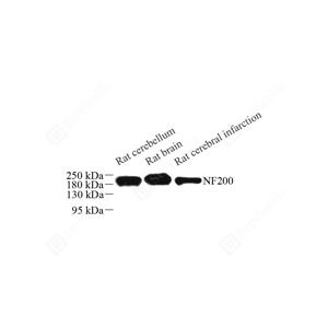 NEFH (NF200), also named as KIAA0845 and NFH, belongs to the intermediate filament family. It has an important function in mature axons that is not subserved by the two smaller NF proteins. Neurofilaments are the 10 nm intermediate filaments found specifically in neurons. They are a major component of the cell's cytoskeleton, and provide support for normal axonal radial growth. Neurofilaments usually contain three intermediate filament proteins: L, M, and H which are involved in the maintenance of neuronal caliber. The names given to the three major neurofilament subunits are based upon the apparent molecular weight of the mammalian subunits on SDS-PAGE: NF-L, 65-68 kDa; NF-M,145-160 kDa and NF-H, 200-220 kDa. This antibody can recognize both NEFH and NEFM.