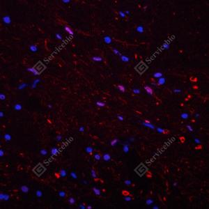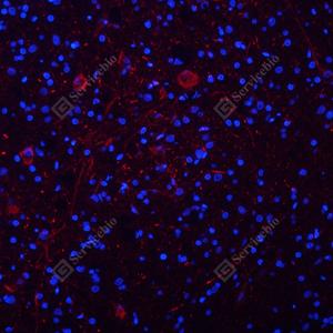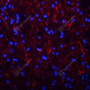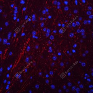 IF检测Neurofilament heavy polypeptide蛋白(货号 GB12144)(红色). 样品: 小鼠脑, 4%多聚甲醛 (货号G1101) 固定12-24小时. 抗原修复: Tris-EDTA抗原修复液(pH 9.0) (G1203), 98℃, 20分钟. 封闭: 3% BSA(货号GC305010)的PBS溶液, 室温孵育30分钟. —抗: 1: 500稀释, 4℃ 孵育过夜. 二抗: Cy3标记山羊抗小鼠IgG (H+L) (货号GB21301), 1: 300稀释, 室温孵育1小时. |