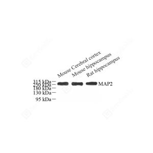 WB检测MAP2蛋白(货号 GB11128-1). 样品: 经RIPA裂解液(货号G2002)处理的蛋白质. 封闭: 封闭: 3%脱脂牛奶(货号GC310001)溶于TBST溶液, 室温孵育1小时. —抗: 1: 500稀释, 4℃ 孵育过夜. 二抗: HRP标记山羊抗兔IgG (H+L) (货号GB23303), 1: 5000稀释, 室温孵育1小时. |