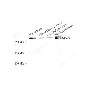 WB检测MAP2蛋白(货号 GB125559). 样品: 经RIPA裂解液(货号G2002)处理的蛋白质. 封闭: 3%脱脂牛奶(货号GC310001)溶于TBST溶液, 室温孵育1小时. —抗: 1: 1000稀释, 4℃ 孵育过夜. 二抗: HRP标记山羊抗小鼠IgG (H+L) (货号GB23301), 1: 5000稀释, 室温孵育1小时. |