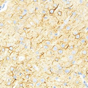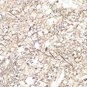 IHC检测68kDa Neurofilament/NF-L蛋白(货号 GB115756). 样品: 人脑, 4%多聚甲醛 (货号G1101) 固定12-24小时. 抗原修复: 柠檬酸抗原修复液(干粉, pH 6.0) (G1201), 98℃, 20分钟. —抗: 1: 500稀释, 4℃ 孵育过夜. 二抗: S-vision免疫组化多聚二抗(山羊抗兔),即用型 (货号G1302), 室温孵育20分钟. |