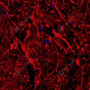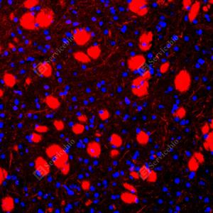 IF检测68kDa Neurofilament/NF-L蛋白(货号 GB115756)(红色). 样品: 人脑, 4%多聚甲醛 (货号G1101) 固定12-24小时. 抗原修复: 柠檬酸抗原修复液(干粉, pH 6.0) (G1201), 98℃, 20分钟. 封闭: 3% BSA(货号GC305010)的PBS溶液, 室温孵育30分钟. —抗: 1: 1000稀释, 4℃ 孵育过夜. 二抗: Cy3标记山羊抗兔IgG (H+L) (货号GB21303), 1: 300稀释, 室温孵育1小时. |