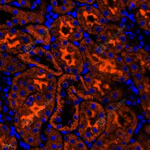 IF检测NRP2蛋白(货号 GB112499)(红色). 样品: 大鼠肾, 4%多聚甲醛 (货号G1101) 固定12-24小时. 抗原修复: Tris-EDTA抗原修复液(pH 9.0) (G1203), 98℃, 20分钟. 封闭: 3% BSA(货号GC305010)的PBS溶液, 室温孵育30分钟. —抗: 1: 650稀释, 4℃ 孵育过夜. 二抗: Cy3标记山羊抗兔IgG (H+L) (货号GB21303), 1: 300稀释, 室温孵育1小时. |