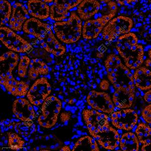 IF检测NRP2蛋白(货号 GB112499)(红色). 样品: 小鼠肾, 4%多聚甲醛 (货号G1101) 固定12-24小时. 抗原修复: Tris-EDTA抗原修复液(pH 9.0) (G1203), 98℃, 20分钟. 封闭: 3% BSA(货号GC305010)的PBS溶液, 室温孵育30分钟. —抗: 1: 650稀释, 4℃ 孵育过夜. 二抗: Cy3标记山羊抗兔IgG (H+L) (货号GB21303), 1: 300稀释, 室温孵育1小时. |