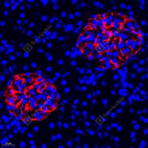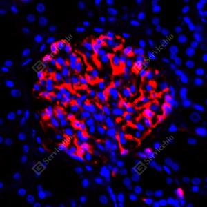 IF检测Nestin蛋白(货号 GB12137)(红色). 样品: 小鼠肾, 4%多聚甲醛 (货号G1101) 固定12-24小时. 抗原修复: 柠檬酸抗原修复液(干粉, pH 6.0) (G1201), 高压锅均匀喷气计时2分钟. 封闭: 3% BSA(货号GC305010)的PBS溶液, 室温孵育30分钟. —抗: 1: 500稀释, 4℃ 孵育过夜. 二抗: Cy3标记山羊抗小鼠IgG (H+L) (货号GB21301), 1: 300稀释, 室温孵育1小时. |