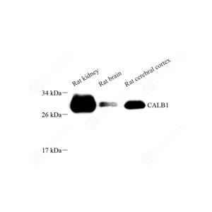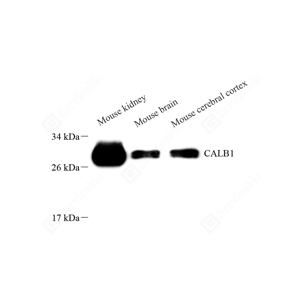 WB检测Calbindin蛋白(货号 GB12268). 样品: 经RIPA裂解液(货号G2002)处理的蛋白质. 封闭: 3%脱脂牛奶(货号GC310001)溶于TBST溶液, 室温孵育1小时. —抗: 1: 1000稀释, 4℃ 孵育过夜. 二抗: HRP标记山羊抗小鼠IgG (H+L) (货号GB23301), 1: 5000稀释, 室温孵育1小时. |