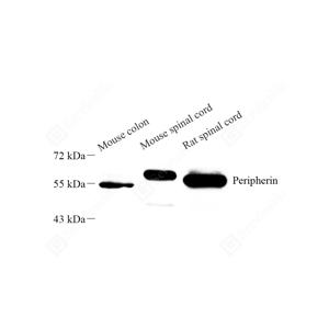 WB检测Peripherin蛋白(货号 GB111635). 样品: 经RIPA裂解液(货号G2002)处理的蛋白质. 封闭: 3%脱脂牛奶(货号GC310001)溶于TBST溶液, 室温孵育1小时. —抗: 1: 1000稀释, 4℃ 孵育过夜. 二抗: HRP标记山羊抗兔IgG (H+L) (货号GB23303), 1: 5000稀释, 室温孵育1小时. |