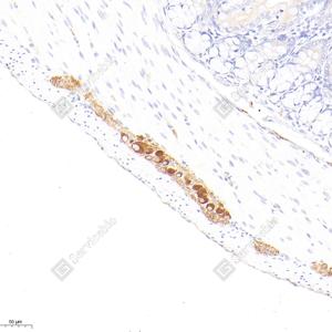 IHC检测Peripherin蛋白(货号 GB111635). 样品: 小鼠结肠, 4%多聚甲醛 (货号G1101) 固定12-24小时. 抗原修复: 柠檬酸抗原修复液(干粉, pH 6.0) (G1201), 98℃, 20分钟. —抗: 1: 1600稀释, 4℃ 孵育过夜. 二抗: HRP标记山羊抗兔IgG (H+L) (货号GB23303), 1: 200稀释, 室温孵育1小时. |