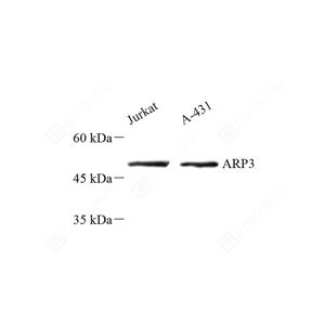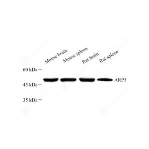 WB检测Arp3蛋白(货号 GB111478). 样品: 经RIPA裂解液(货号G2002)处理的蛋白质. 封闭: 封闭: 3%脱脂牛奶(货号GC310001)溶于TBST溶液, 室温孵育1小时. —抗: 1: 500稀释, 4℃ 孵育过夜. 二抗: HRP标记山羊抗兔IgG (H+L) (货号GB23303), 1: 5000稀释, 室温孵育1小时. |