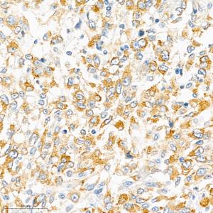 IHC检测Eph receptor B4/HTK蛋白(货号 GB111362). 样品: 人甲状腺癌, 4%多聚甲醛 (货号G1101) 固定12-24小时. 抗原修复: 柠檬酸抗原修复液(干粉, pH 6.0) (G1201), 98℃, 20分钟. —抗: 1: 1500稀释, 4℃ 孵育过夜. 二抗: HRP标记山羊抗兔IgG (H+L) (货号GB23303), 1: 200稀释, 室温孵育1小时. |