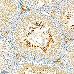 IHC检测LIMK1蛋白(货号 GB11994). 样品: 大鼠睾丸, 4%多聚甲醛 (货号G1101) 固定12-24小时. 抗原修复: 柠檬酸抗原修复液(干粉, pH 6.0) (G1201), 98℃, 20分钟. —抗: 1: 2000稀释, 4℃ 孵育过夜. 二抗: HRP标记山羊抗兔IgG (H+L) (货号GB23303), 1: 200稀释, 室温孵育1小时. |