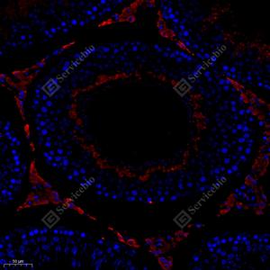 IF检测LIMK1蛋白(货号 GB11994)(红色). 样品: 大鼠睾丸, 4%多聚甲醛 (货号G1101) 固定12-24小时. 抗原修复: Tris-EDTA抗原修复液(pH 9.0) (G1203), 98℃, 20分钟. 封闭: 3% BSA(货号GC305010)的PBS溶液, 室温孵育30分钟. —抗: 1: 1500稀释, 4℃ 孵育过夜. 二抗: Cy3标记山羊抗兔IgG (H+L) (货号GB21303), 1: 300稀释, 室温孵育1小时. |