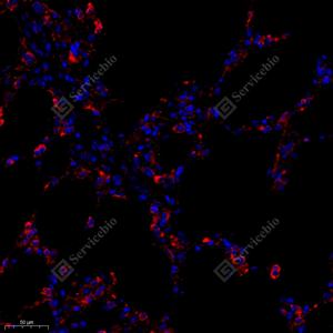 IF检测LIMK1蛋白(货号 GB11994)(红色). 样品: 大鼠肺, 4%多聚甲醛 (货号G1101) 固定12-24小时. 抗原修复: Tris-EDTA抗原修复液(pH 9.0) (G1203), 98℃, 20分钟. 封闭: 3% BSA(货号GC305010)的PBS溶液, 室温孵育30分钟. —抗: 1: 1500稀释, 4℃ 孵育过夜. 二抗: Cy3标记山羊抗兔IgG (H+L) (货号GB21303), 1: 300稀释, 室温孵育1小时. |