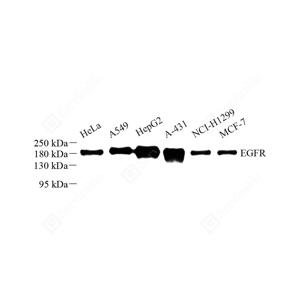 | WB检测EGFR蛋白(货号 GB111505). 样品: 经RIPA裂解液(货号G2002)处理的蛋白质. 封闭: 3%脱脂牛奶(货号GC310001)溶于TBST溶液, 室温孵育1小时. —抗: 1: 1000稀释, 4℃ 孵育过夜. 二抗: HRP标记山羊抗兔IgG (H+L) (货号GB23303), 1: 5000稀释, 室温孵育1小时. |