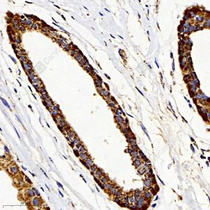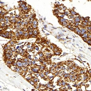 IHC检测IGF1蛋白(货号 GB11248). 样品: 人食管癌, 4%多聚甲醛 (货号G1101) 固定12-24小时. 抗原修复: 柠檬酸抗原修复液(干粉, pH 6.0) (G1201), 98℃, 20分钟. —抗: 1: 1000稀释, 4℃ 孵育过夜. 二抗: HRP标记山羊抗兔IgG (H+L) (货号GB23303), 1: 200稀释, 室温孵育1小时. |
