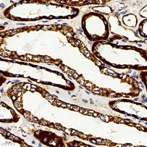 IHC检测IGF1蛋白(货号 GB11248). 样品: 人肾, 4%多聚甲醛 (货号G1101) 固定12-24小时. 抗原修复: 柠檬酸抗原修复液(干粉, pH 6.0) (G1201), 98℃, 20分钟. —抗: 1: 1000稀释, 4℃ 孵育过夜. 二抗: HRP标记山羊抗兔IgG (H+L) (货号GB23303), 1: 200稀释, 室温孵育1小时. |
