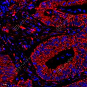 IF检测IGF1蛋白(货号 GB11248)(红色). 样品: 人结肠癌, 4%多聚甲醛 (货号G1101) 固定12-24小时. 抗原修复: Tris-EDTA抗原修复液(pH 9.0) (G1203), 98℃, 20分钟. 封闭: 3% BSA(货号GC305010)的PBS溶液, 室温孵育30分钟. —抗: 1: 1000稀释, 4℃ 孵育过夜. 二抗: Cy3标记山羊抗兔IgG (H+L) (货号GB21303), 1: 300稀释, 室温孵育1小时. |