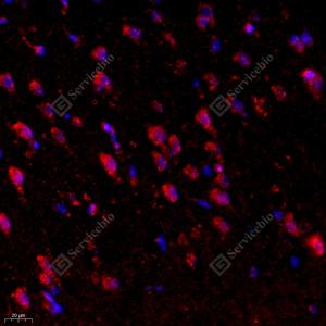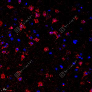 IF检测IGF1蛋白(货号 GB11248)(红色). 样品: 小鼠脑, 4%多聚甲醛 (货号G1101) 固定12-24小时. 抗原修复: Tris-EDTA抗原修复液(pH 9.0) (G1203), 98℃, 20分钟. 封闭: 3% BSA(货号GC305010)的PBS溶液, 室温孵育30分钟. —抗: 1: 1000稀释, 4℃ 孵育过夜. 二抗: Cy3标记山羊抗兔IgG (H+L) (货号GB21303), 1: 300稀释, 室温孵育1小时. |