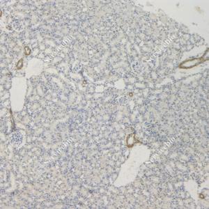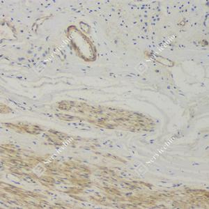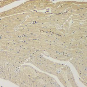 | IHC检测IGF1蛋白(货号 GB111980). 样品: 小鼠心, 4%多聚甲醛 (货号G1101) 固定12-24小时. 抗原修复: 柠檬酸抗原修复液(干粉, pH 6.0) (G1201), 高压锅均匀喷气计时2分钟. —抗: 1: 250稀释, 4℃ 孵育过夜. 二抗: HRP标记山羊抗兔IgG (H+L) (货号GB23303), 1: 200稀释, 室温孵育1小时. |