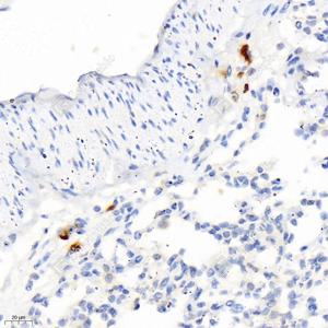 IHC检测PDGF B蛋白(货号 GB11261). 样品: 大鼠肺, 4%多聚甲醛 (货号G1101) 固定12-24小时. 抗原修复: 柠檬酸抗原修复液(干粉, pH 6.0) (G1201), 98℃, 20分钟. —抗: 1: 300稀释, 4℃ 孵育过夜. 二抗: HRP标记山羊抗兔IgG (H+L) (货号GB23303), 1: 200稀释, 室温孵育1小时. |