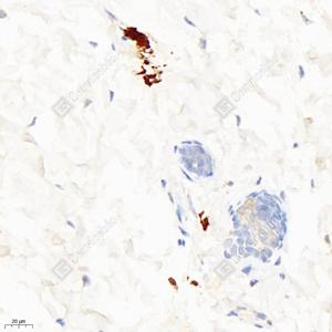 IHC检测PDGF B蛋白(货号 GB11261). 样品: 小鼠皮肤, 4%多聚甲醛 (货号G1101) 固定12-24小时. 抗原修复: 柠檬酸抗原修复液(干粉, pH 6.0) (G1201), 98℃, 20分钟. —抗: 1: 300稀释, 4℃ 孵育过夜. 二抗: HRP标记山羊抗兔IgG (H+L) (货号GB23303), 1: 200稀释, 室温孵育1小时. |