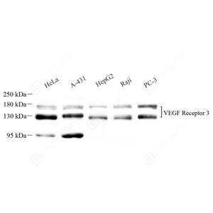 WB检测VEGF Receptor 3蛋白(货号 GB112339). 样品: 经RIPA裂解液(货号G2002)处理的蛋白质. 封闭: 3%脱脂牛奶(货号GC310001)溶于TBST溶液, 室温孵育1小时. —抗: 1: 1000稀释, 4℃ 孵育过夜. 二抗: HRP标记山羊抗兔IgG (H+L) (货号GB23303), 1: 5000稀释, 室温孵育1小时. |