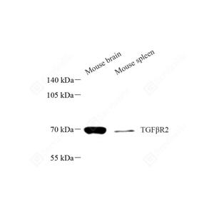 WB检测TGF beta Receptor II蛋白(货号 GB115425). 样品: 经RIPA裂解液(货号G2002)处理的蛋白质. 封闭: 封闭: 3%脱脂牛奶(货号GC310001)溶于TBST溶液, 室温孵育1小时. —抗: 1: 600稀释, 4℃ 孵育过夜. 二抗: HRP标记山羊抗兔IgG (H+L) (货号GB23303), 1: 5000稀释, 室温孵育1小时. |