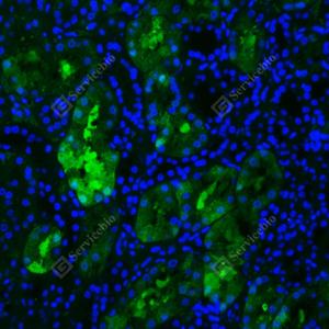 IF检测FGFR1蛋白(货号 GB115541)(绿色). 样品: 人肾, 4%多聚甲醛 (货号G1101) 固定12-24小时. 抗原修复: Tris-EDTA抗原修复液(pH 9.0) (G1203), 98℃, 20分钟. 封闭: 3% BSA(货号GC305010)的PBS溶液, 室温孵育30分钟. —抗: 1: 100稀释, 4℃ 孵育过夜. 二抗: Alexa Fluor 488标记山羊抗兔IgG (H+L) (货号GB25303), 1: 400稀释, 室温孵育1小时. |