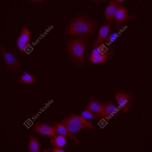 ICC检测FGFR1蛋白(货号 GB115541)(红色). 样品: 3A431细胞, 4%多聚甲醛 (货号G1101) 固定20分钟. 封闭: 3% BSA(货号GC305010)的PBS溶液, 室温孵育30分钟. —抗: 1: 200稀释, 4℃ 孵育过夜. 二抗: Cy3标记山羊抗兔IgG (H+L) (货号GB21303), 1: 300稀释, 室温孵育1小时. |