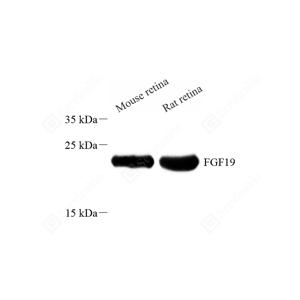 WB检测FGF19蛋白(货号 GB114817). 样品: 经RIPA裂解液(货号G2002)处理的蛋白质. 封闭: 封闭: 3%脱脂牛奶(货号GC310001)溶于TBST溶液, 室温孵育1小时. —抗: 1: 300稀释, 4℃ 孵育过夜. 二抗: HRP标记山羊抗兔IgG (H+L) (货号GB23303), 1: 5000稀释, 室温孵育1小时. |