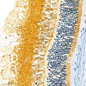 IHC检测FGF11蛋白(货号 GB111083). 样品: 大鼠眼球, 4%多聚甲醛 (货号G1101) 固定12-24小时. 抗原修复: 柠檬酸抗原修复液(干粉, pH 6.0) (G1201), 98℃, 20分钟. —抗: 1: 2200稀释, 4℃ 孵育过夜. 二抗: HRP标记山羊抗兔IgG (H+L) (货号GB23303), 1: 200稀释, 室温孵育1小时. |