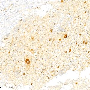 IHC检测FGF11蛋白(货号 GB111083). 样品: 大鼠脊髓, 4%多聚甲醛 (货号G1101) 固定12-24小时. 抗原修复: 柠檬酸抗原修复液(干粉, pH 6.0) (G1201), 98℃, 20分钟. —抗: 1: 2200稀释, 4℃ 孵育过夜. 二抗: HRP标记山羊抗兔IgG (H+L) (货号GB23303), 1: 200稀释, 室温孵育1小时. |