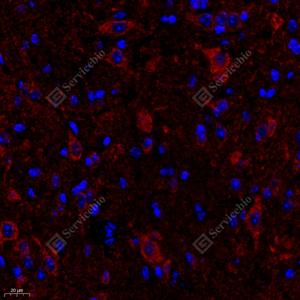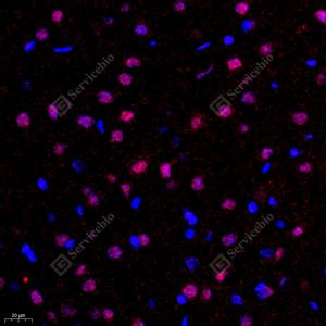 IF检测FGF11蛋白(货号 GB111083)(红色). 样品: 大鼠海马区, 4%多聚甲醛 (货号G1101) 固定12-24小时. 抗原修复: Tris-EDTA抗原修复液(pH 9.0) (G1203), 98℃, 20分钟. 封闭: 3% BSA(货号GC305010)的PBS溶液, 室温孵育30分钟. —抗: 1: 2200稀释, 4℃ 孵育过夜. 二抗: Cy3标记山羊抗兔IgG (H+L) (货号GB21303), 1: 300稀释, 室温孵育1小时. |