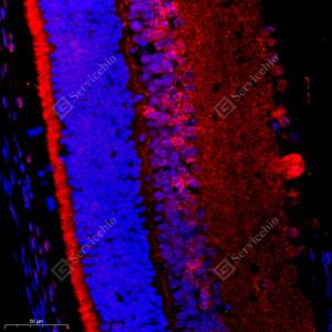 IF检测FGF11蛋白(货号 GB111083)(红色). 样品: 大鼠眼球, 4%多聚甲醛 (货号G1101) 固定12-24小时. 抗原修复: Tris-EDTA抗原修复液(pH 9.0) (G1203), 98℃, 20分钟. 封闭: 3% BSA(货号GC305010)的PBS溶液, 室温孵育30分钟. —抗: 1: 2200稀释, 4℃ 孵育过夜. 二抗: Cy3标记山羊抗兔IgG (H+L) (货号GB21303), 1: 300稀释, 室温孵育1小时. |